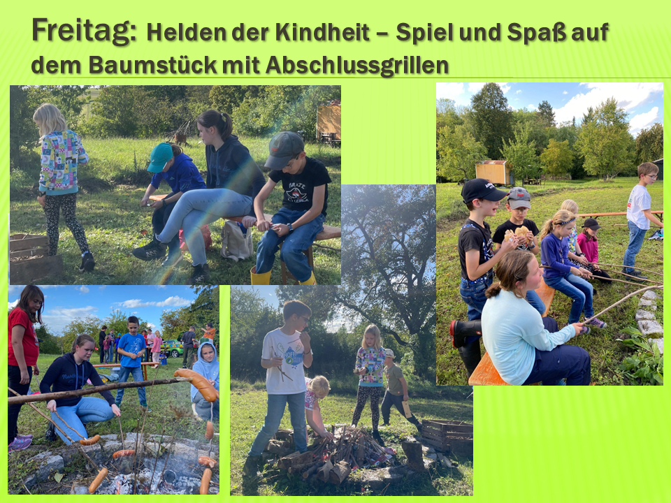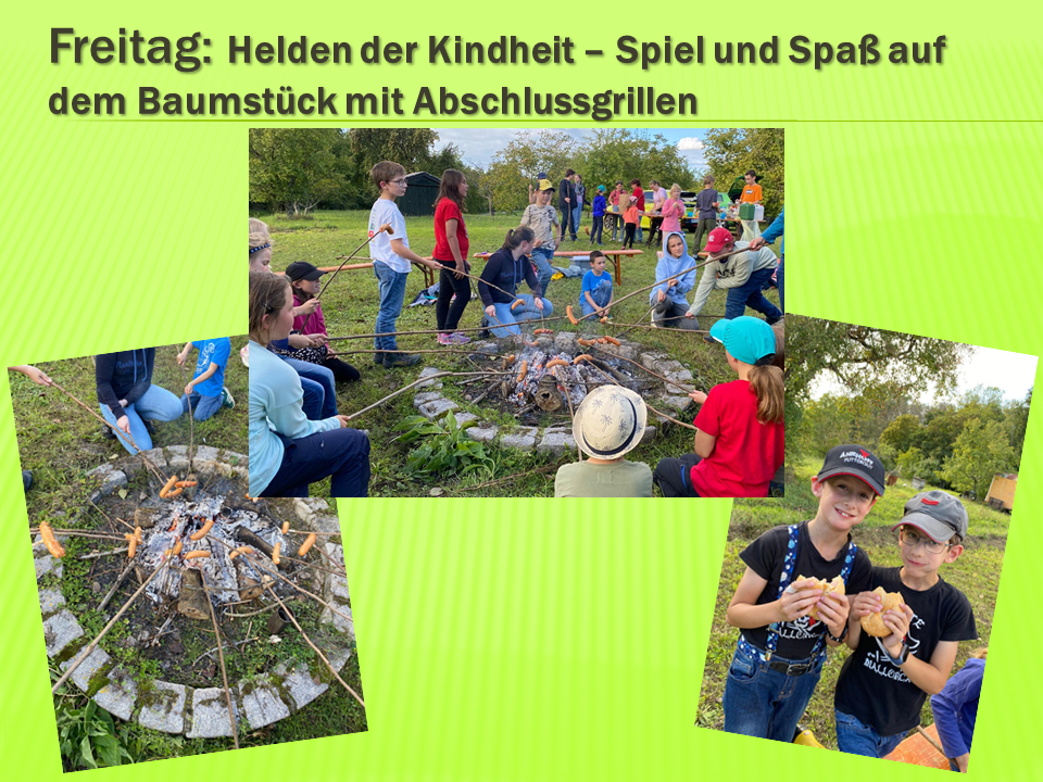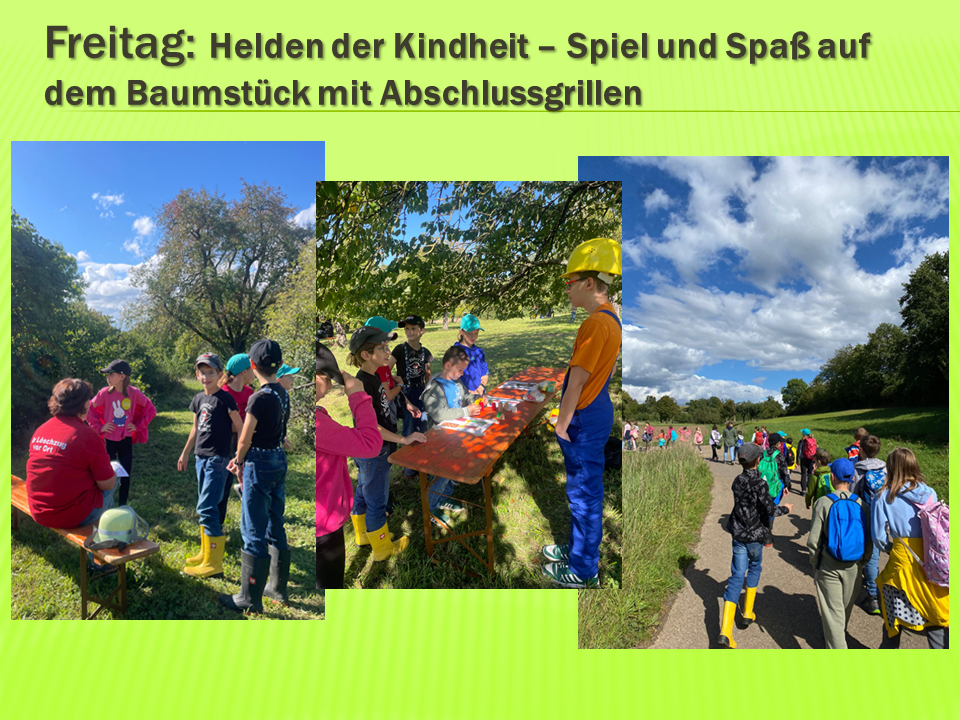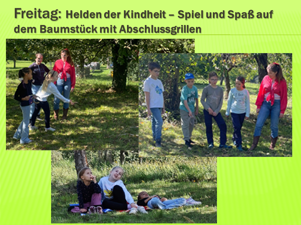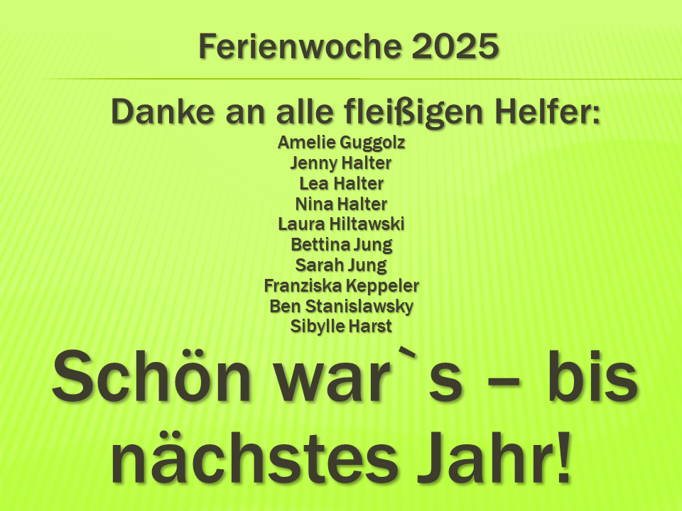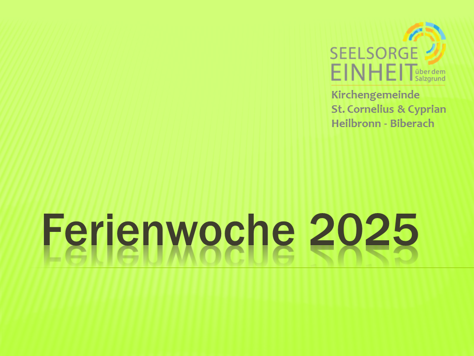 Jedes Jahr in der letzten Sommerferienwoche bietet das ökumenische Team der Ferienwoche den Kindern und Jugendlichen ein abwechslungsreiches und spaßgarantiertes Programm. Die einzelnen Tage von Montag bis Freitag sind individuell gestaltet und bieten eine breite Palette von Aktionen vor Ort bis hin zu Ausflügen. An welchen Tagen man an dem Programm teilnehmen möchte, kann man per Anmeldung im Voraus entscheiden.