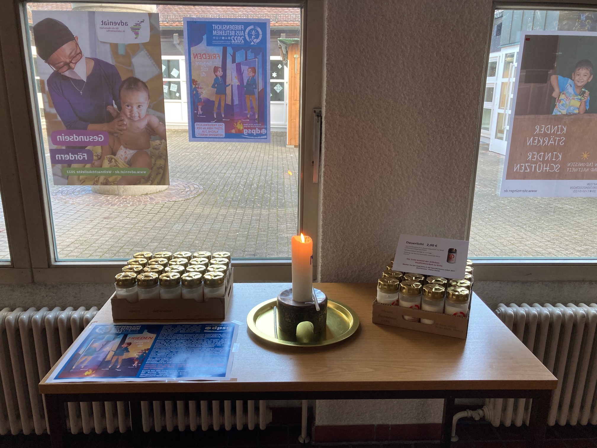 Damit Sie die Flamme sicher nach Hause bringen können, stehen wieder Dauerlichter mit einem Windschutz  bereit (Brenndauer ca. 2,5 Tage). Gegen eine Spende von 2,50 € können Sie gerne so ein Dauerlicht mitnehmen. Der Erlös der Friedenslichtaktion wird Kindern in Betlehem zu Gute kommen.